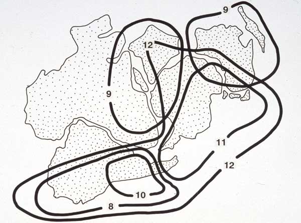 This pattern illustrates the position of the Loranthaceae as part of the ‘paleoaustral’ element of the world flora (below, chromosome numbers shown). Even though the mistletoes are highly specialized in terms of life form, they must have had a long history in the southern lands. Their present distribution is consistent with their existence as part of the Gondwanan flora prior to fragmentation of the southern supercontinent in the Cretaceous period. The predominantly tropical nature of their present geographical and taxonomic distribution reflects the evolutionary responses which have followed the displacement and isolation of the southern continental plates.
