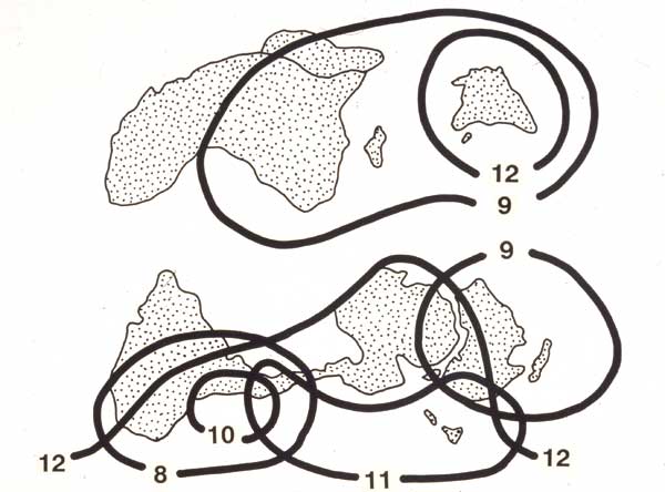 The number x = 9 is characteristic of all the remaining, derived and advanced genera of the Old World, from Australia to Asia and Africa (tribe Lorantheae). Similarly, all of the remaining genera of the New World characteristically have x = 8, including the large, advanced tropical genera of tribe Struthantheae. The pattern which emerges is therefore one in which an ancestral stock with x = 12 was widespread in the southern lands, and in which stepwise reduction to x = 9 and 8 has preceded massive evolutionary radiation of the family in the tropics. That this radiation has been independent in the Old and New Worlds is indicated by the fact that the derived stocks, with x = 9 and 8 respectively, have closer affinities with the old southern groups than with each other. A limited independent radiation in the Indomalayan region of the Old World has apparently occurred in a stock which has retained the number x = 12.