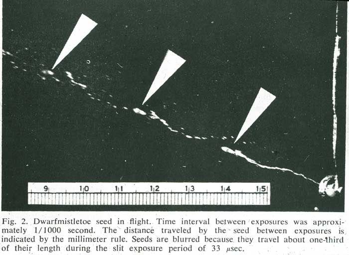 the fruits are strongly explosive, and are usually oriented at an angle of 45° to the horizontal. When the seed is discharged from the fruit it therefore attains maximum trajectory (see illustration), and the discharge velocity is sufficient to disperse the sticky seeds to adjacent trees in the conifer forests. The other genus, Korthalsella, which is represented in Australia, is reported to have weakly explosive fruits. Korthalsella plants are small (mostly less than 10 cm tall