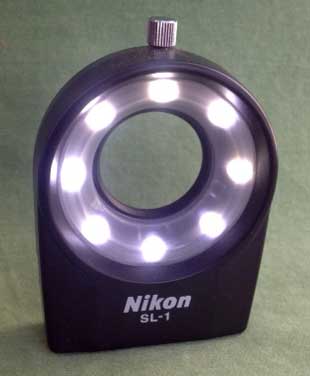 The Nikon 'ring-flash' is actually two strobe-lights, one on each side of the lens. |
