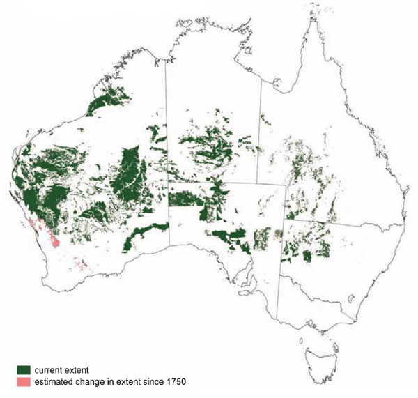 Sources: Australia's Native Vegetation - from rainforest to spinifex, map and information poster produced by the National Land & Water Audit, Natural Heritage Trust, Australian Government, 2001