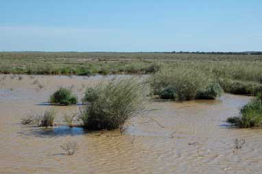 ![]() Claypan with canegrass, Eragrostis australasica, with surface water after rain, western NSW |
