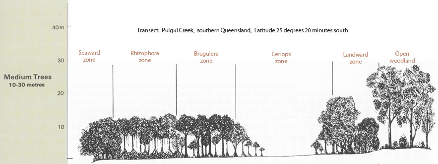 ![]() Transect: Daintree River, North Queensland. Latitude 16° 17' south The Seaward zone is narrow and may be either Sonneratia alba or Avicennia marina. The Rhizophora zone is mainly Rhizophora stylosa with minor Rhizophora apiculata. The Bruguiera Zone is composed mainly of Bruguiera gymnorhiza with distinct stands of Bruguiera parviflora. The Ceriops zone only occurs in open areas and minor tidal channels. In this zone may be found Ceriops decandra, Lumnitzera littorea, Excoecaria agallocha, Cynometra ramiflora and Scyphiphora hydrophyllacea. In the landward zone an association of Bruguiera gymnorrhiza, Xylocarpus granatum, Xylocarpus australasicus and Heritiera littoralis which at the top of the highest tide merges with tropical rain forest (Tall Closed Forest). |
