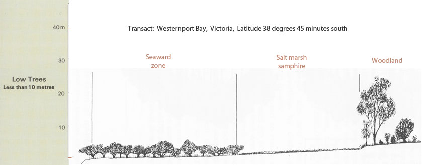 ![]() Transect: Westernport Bay, Victoria, Latitude 38° 45' south Only one species, a dwarfed, many-stemmed form of Avicennia marina is found at this latitude, fringing salt marsh also growing below the level of the highest tide. |