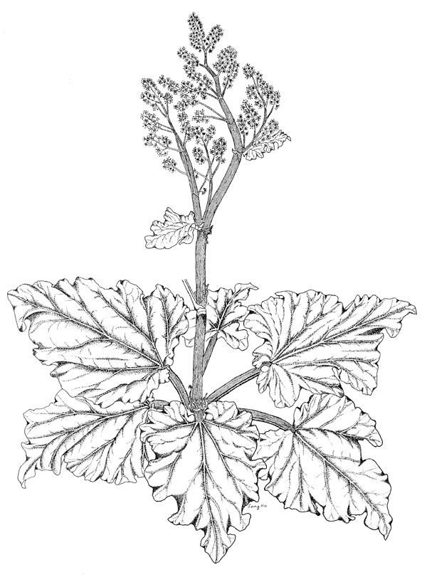 Garden Rhubarb, Pieplant Leaves of this plant are toxic. The coloured stalks which are eaten as stewed fruit are no longer permitted to be sold with the leaves on. |