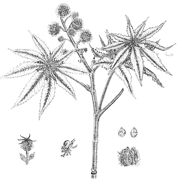 Castor Oil Plant, Palma Christi This plant is dangerously poisonous. It is a very ornamental plant when in leaf. The reddish flowers produce soft spiny fruits in interesting bunches attractive to children. The seeds are very toxic. .One seed can cause severe poisoning. |