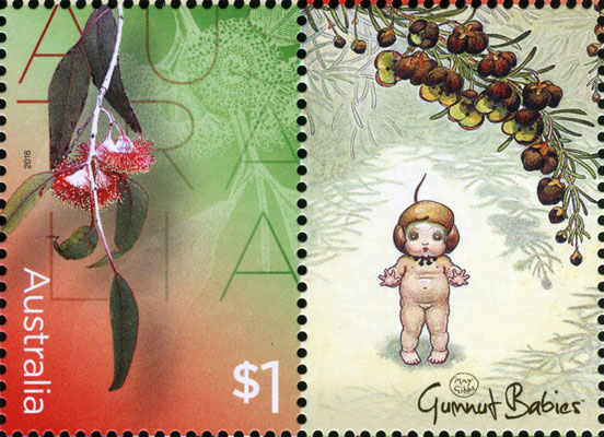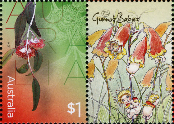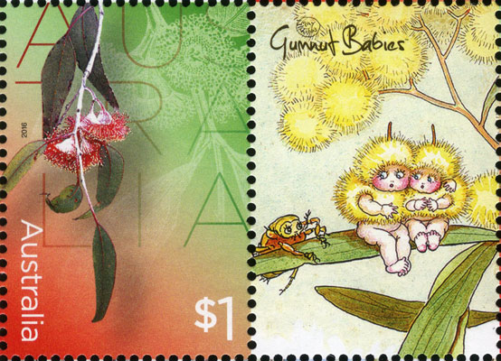 Date of issue: 29 March 2016 Plant: ? Eucalyptus caesia Family: MYRTACEAE The May Gibbs 'stamp' is not a valid postage stamp, and can only be used in association with a valid stamp. Four examples from the stamp pack are shown here.